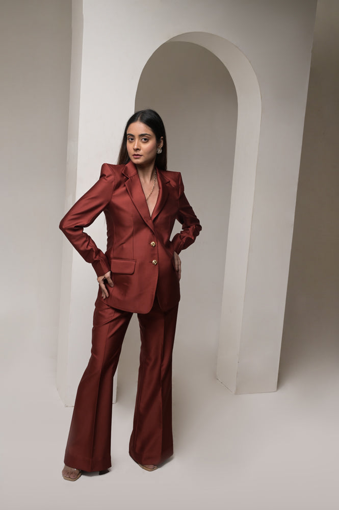 Description : - Athena set is a perfect blend of style, craftmanship and functionality. The jacket features sculpted shoulders and cinched waist, boasting an hourglass silhouette. Paired perfectly with flared pants adds even more drama to the pagoda shoulders. Cut from luxurious suiting fabric this outfit is a no brainer.