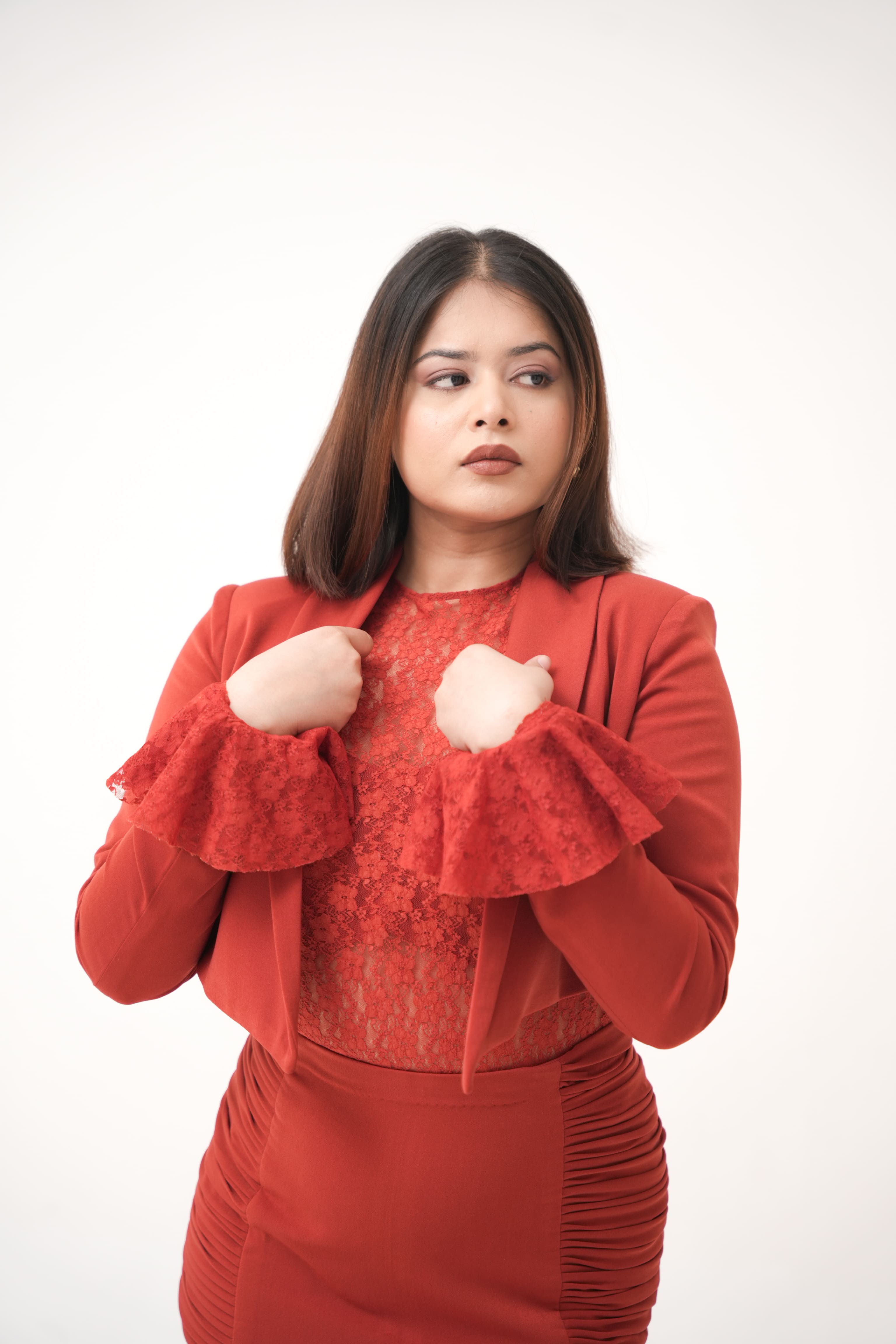 Description : - Ciara set comprises of a beautiful lace bodysuit with frill detailing on sleeves , a meticulously tailored cropped blazer with sculpted shoulders complimented with a flared asymmetrical skirt that hugs the body to give a beautiful silhouette. The bodysuit has lining only on the front the back is lacy net. This set exudes refined luxury, this set is a must have for women who blazes her trail unapologetically and with poise.